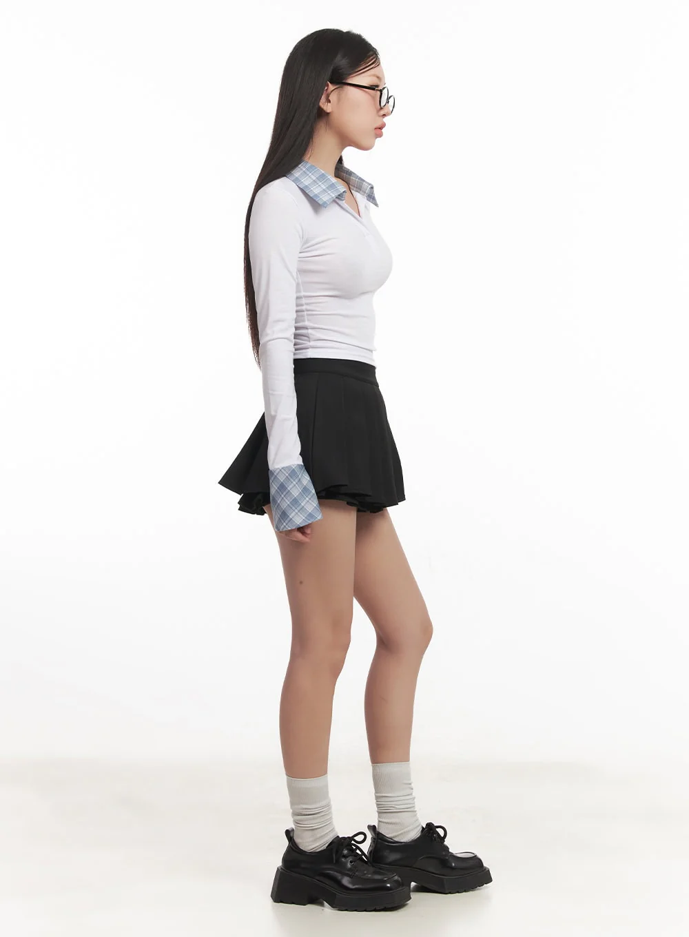 Checkered-Collar Long-Sleeve Crop Top CM531